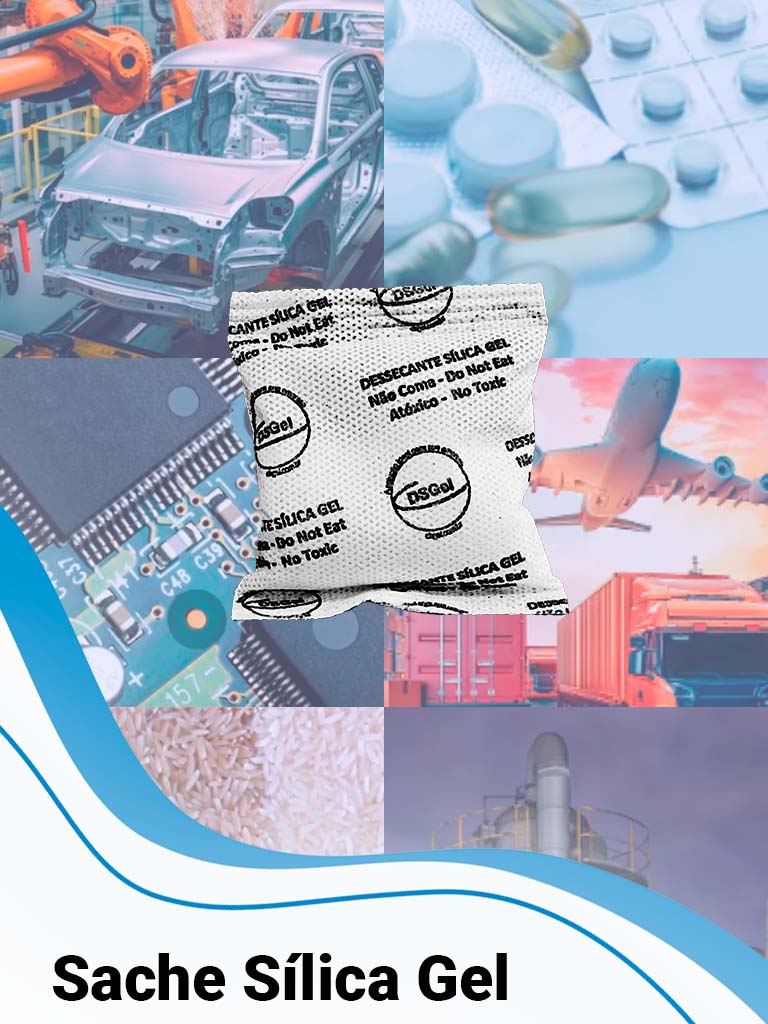 Saches em vários tamanhos e tipos de sílica gel, definidos de acordo com a aplicação específica para a necessidade de cada cliente, amplamente utilizados nos diversos ramos de atividade das indústrias, entre elas: farmacêutica, alimentícia, embalagens, transportes, automobilística, confecção, calçados, agronegócio e outras.